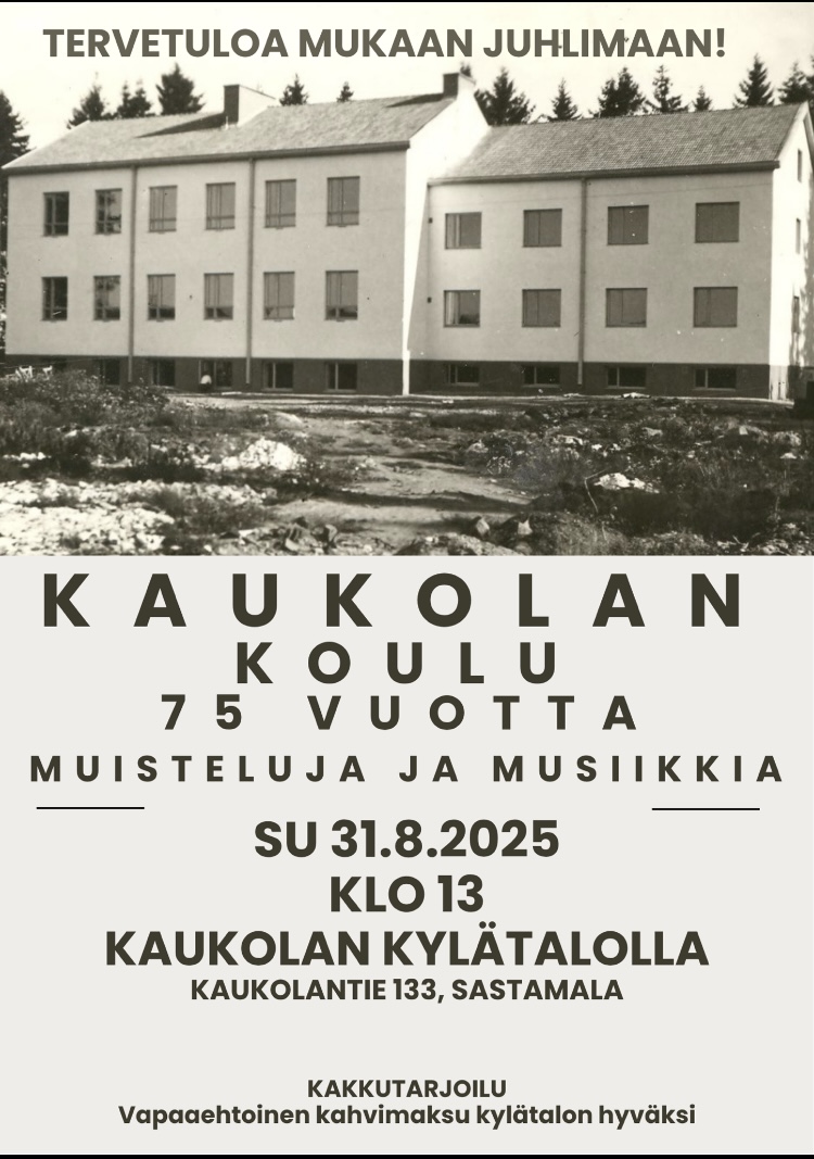 Kaukolan nykyisellä kylätalolla järjestetään ennen kouluna toimineen rakennuksen 75-vuotisjuhla su 31.8. klo 13 alkaen. Vuonna 1948 alkaneen rakennusvaiheen jälkeen Kaukolan koulu vihittiin käyttöön syyskuussa 1950 ja ehti olla opinahjona monille koululaisille aina kevääseen 2017 asti. Seuraavana vuonna Sastamalan kaupunki myi rakennuksen Kaukolan kyläseuralle, jonka omistuksessa rakennus on aktiivisessa käytössä kylätalona.