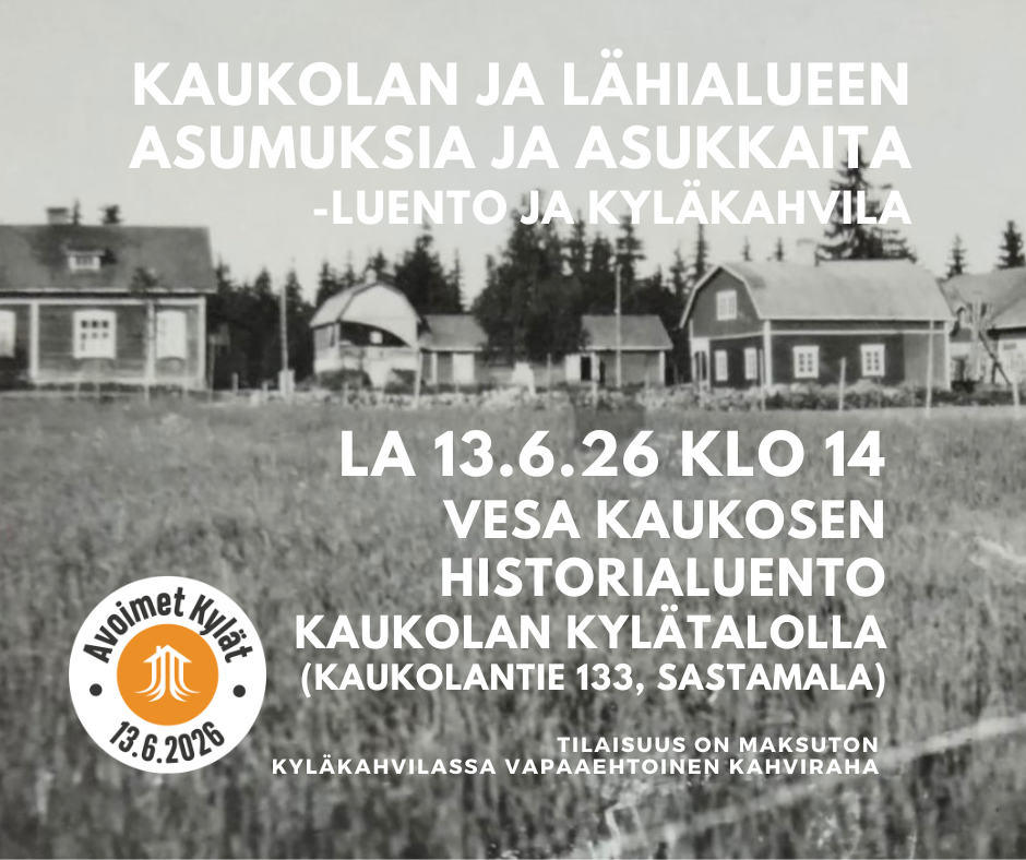 Valtakunnallisena Avoimet Kylät -päivänä la 14.6. klo 14 Kaukolan kylätalolla päästään kuulemaan Vesa Kaukosen historialuentoa Kaukolan ja lähialueen kehityskuluista ja kohtalonhetkistä. Kannattaa lähteä kuulolle! Luennolle vapaa pääsy. Kylätalolla samalla myös kyläkahvila, jossa vapaaehtoinen kahviraha.
