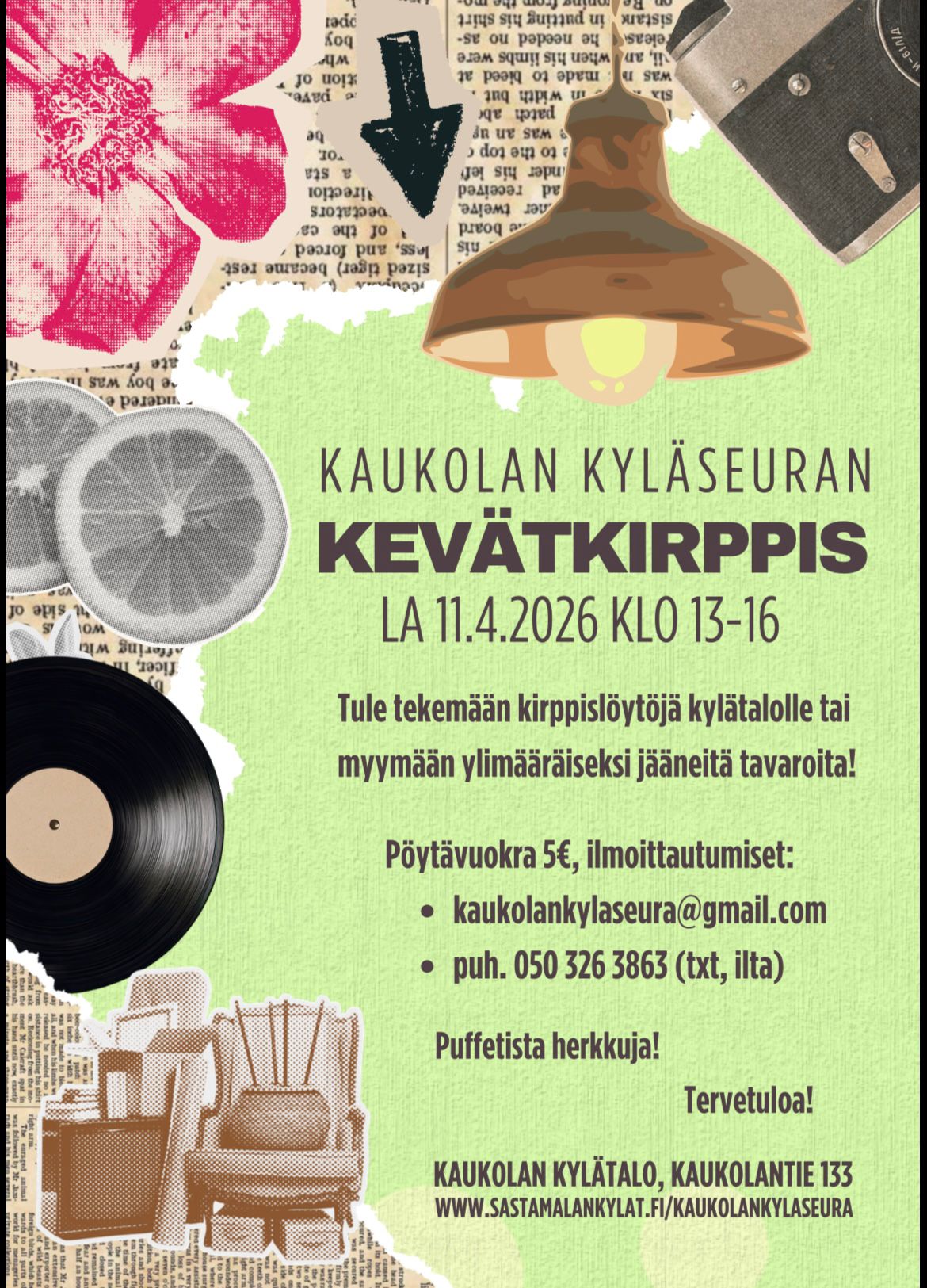 Tule tekemään kirppislöytöjä tai myymään ylimääräiseksi jääneitä tavaroita! Kylätalolla on myös avoinna kyläkahvila tapahtuman ajan