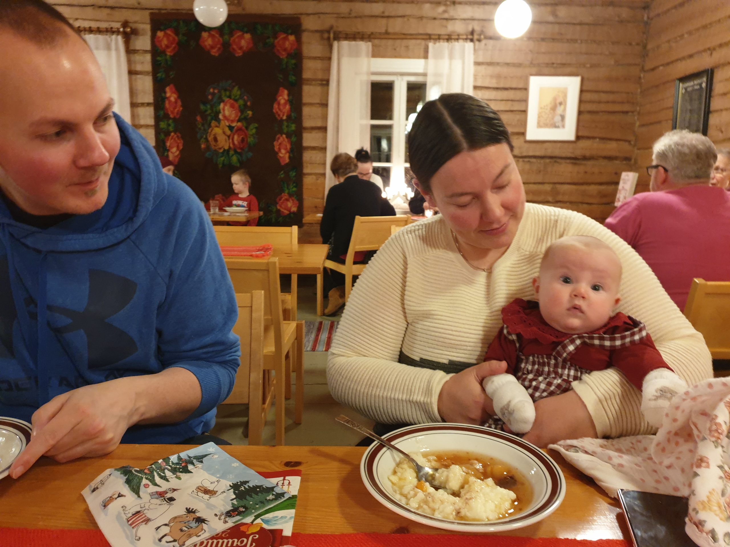 Joulujuhlan nuorin oli Lilian, joka oli matkassa vanhempiensa Saara Karhun ja Joni Uusinokan kanssa.