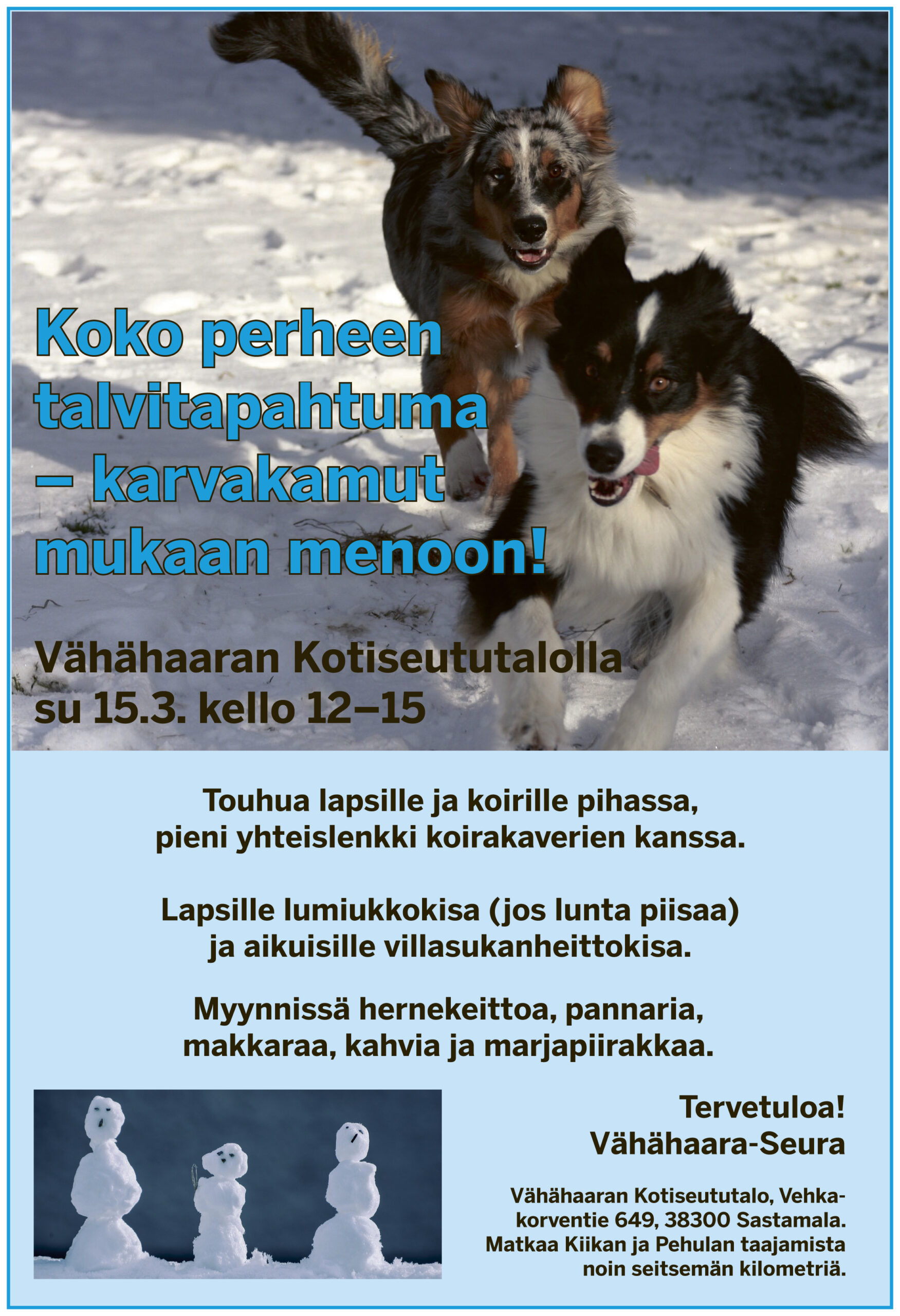 Luvassa pientä touhua lapsille ja koirille pihassa, yhteislenkki koirakaverien kanssa, lapsille lumiukkokisaa joko lumesta tai piirtäen (lumitilanteen mukaan), aikuisille villasukanheittokisa.